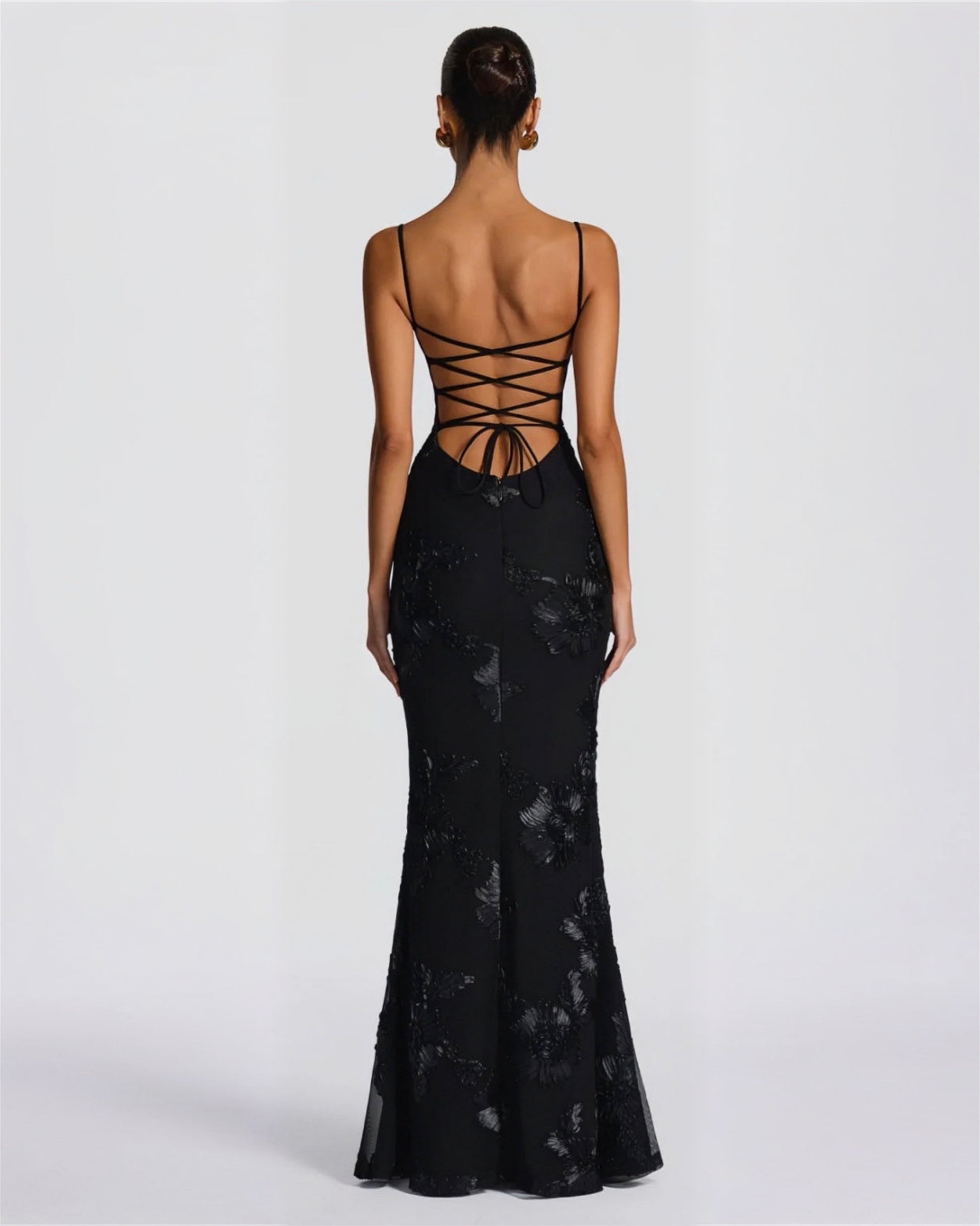 A fitted maxi gown crafted from embroidered floral mesh with a smooth stretch inner layer. Designed with a structured bust, slim straps, and an adjustable lace-up back that shapes the body and follows your natural lines. The skirt falls straight with a soft flare for movement.