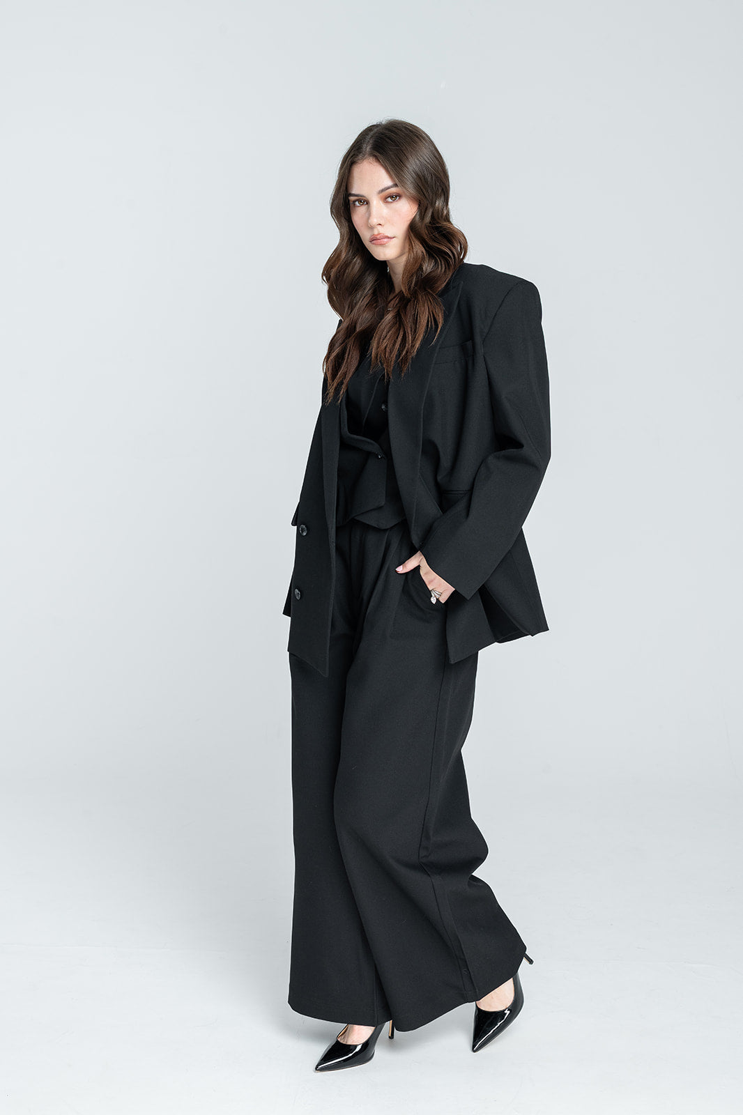 A refined wide-leg tailored trouser designed with soft pleats, a fluid drape, and a sculpted silhouette. The partially elastic back waistband adds comfort while maintaining a sharp, structured front. Perfect paired with blazers, crisp shirts, or minimal knits for a modern, elevated look.