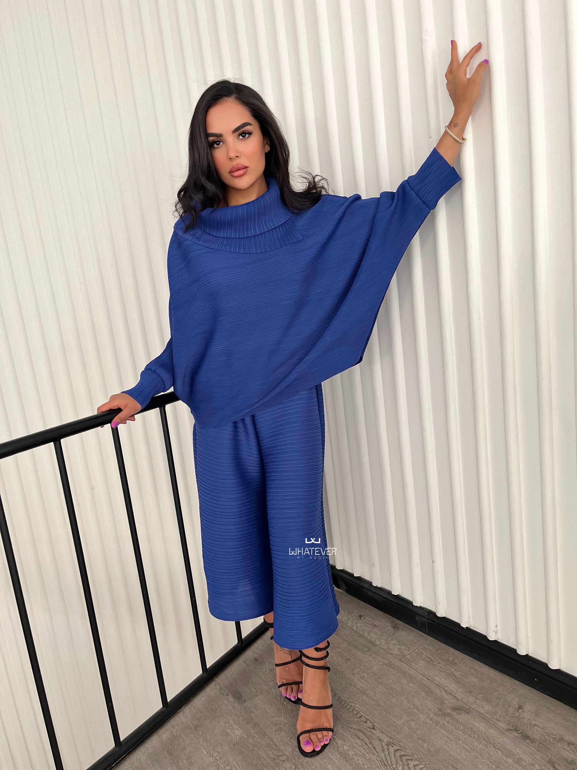 Where structure meets flow — the Mara Pleated Set is a modern take on loungewear chic. This two-piece set features a sculptural high-collar blouse with dolman sleeves and wide-leg cropped pants, both crafted from fully pleated textured fabric that moves effortlessly with your body.