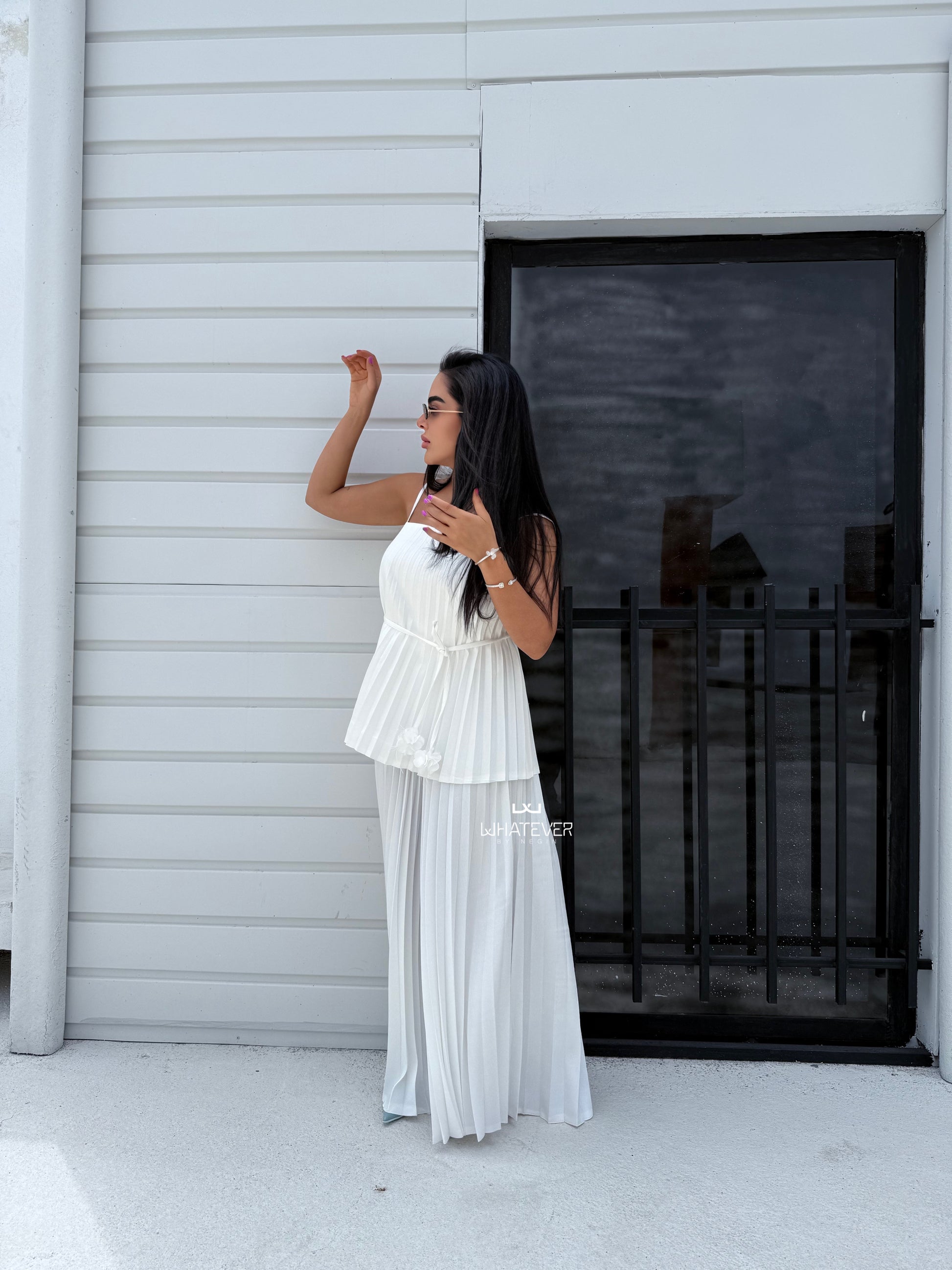 Meet Naia — light as air, soft as light. This two-piece set features a fluid pleated blouse and matching wide-leg pants, designed to flow with you. The sheer texture and sculpted pleats create soft movement, while delicate florals on the belt hint at feminine restraint. Effortlessly romantic, endlessly versatile.
