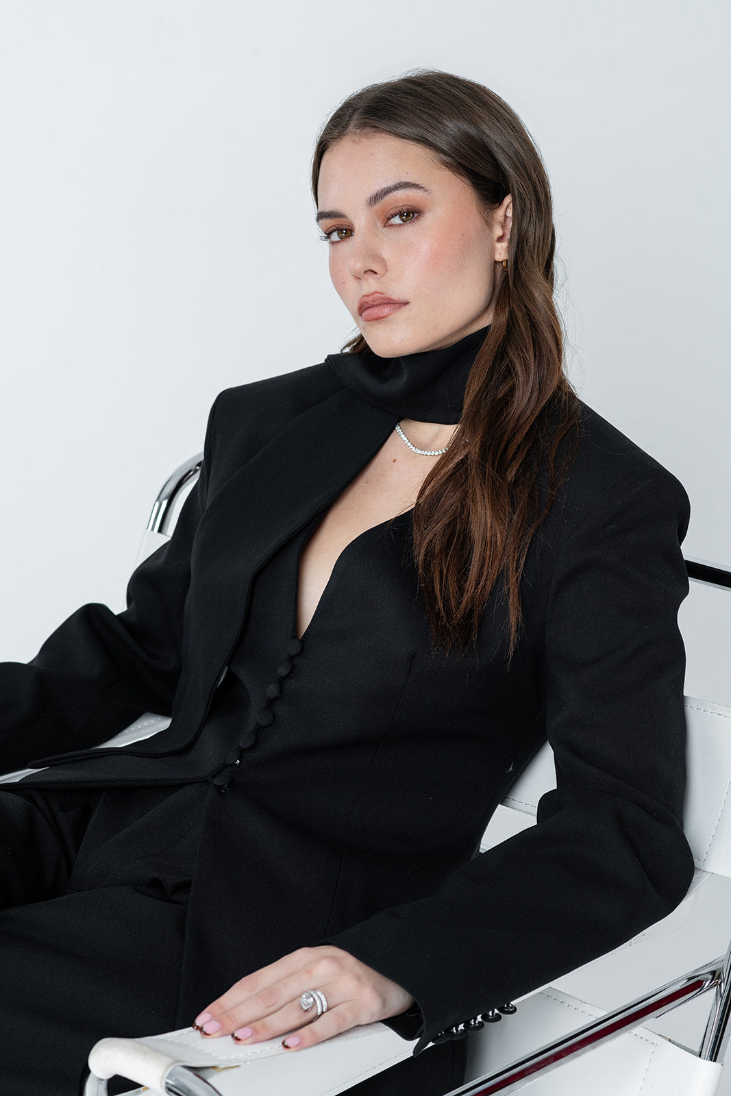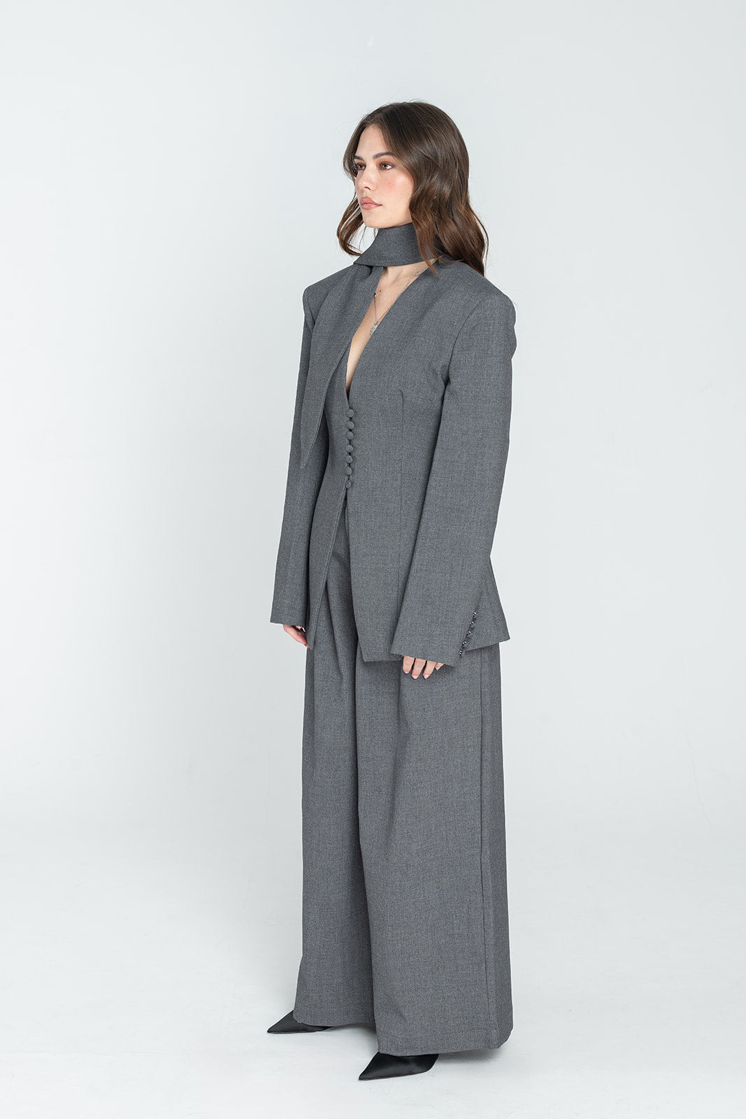A sculpted tuxedo blazer with a sharply tailored silhouette. Designed with a deep V neckline, structured shoulders, and a clean button-front closure finished with fabric-covered buttons. The detachable scarf detail adds a refined, editorial edge — allowing the piece to shift effortlessly between minimal power dressing and elevated evening wear. Precise tailoring through the waist enhances the silhouette while maintaining a modern, confident feel.