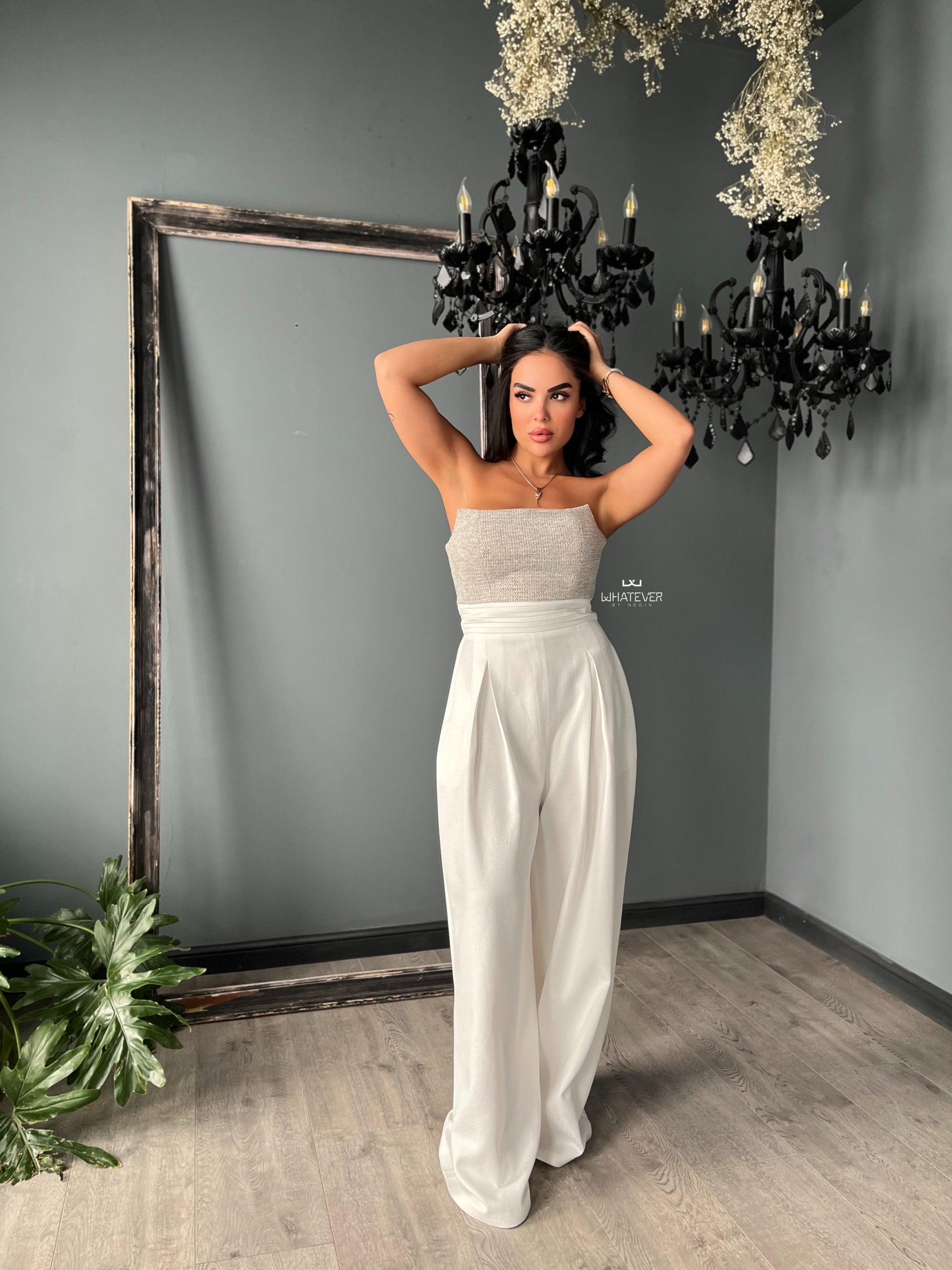 Minimal effort, maximum impact — the Solene Strapless Jumpsuit redefines quiet luxury. Tailored from a single-tone textured jacquard fabric, it features a structured strapless bodice and voluminous wide-leg pants with soft pleats for added movement.